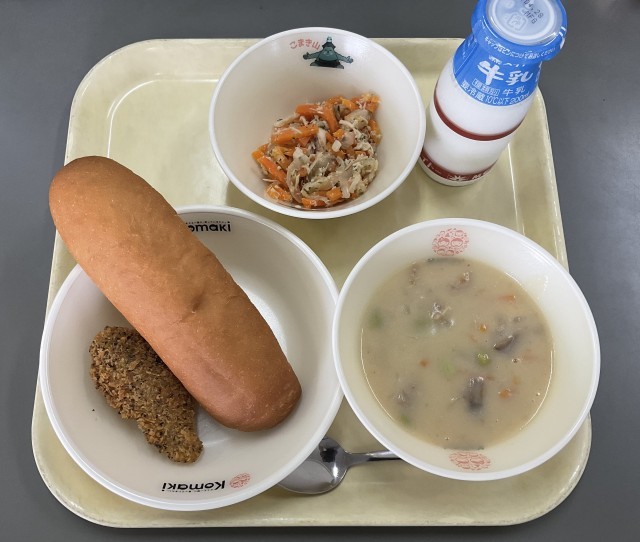 ミルクロールパン 牛乳 豆乳入りポテトポタージュ ほきの香味フライ にんじんとチキンのマリネ