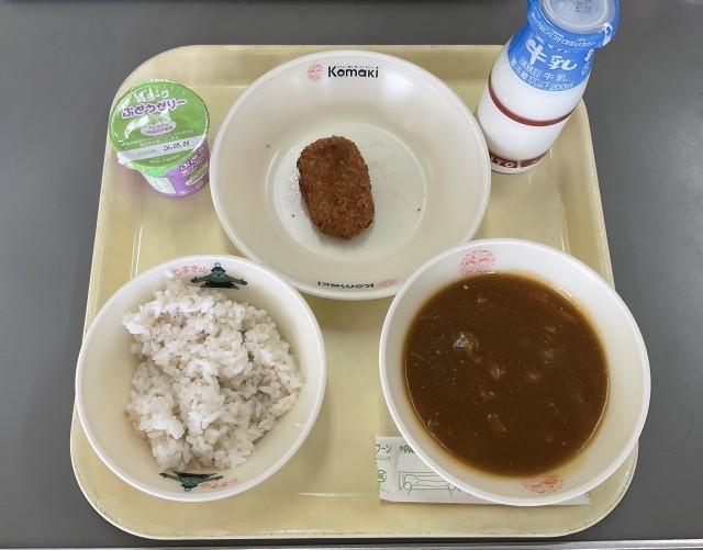 麦ごはん 牛乳 カレーライス コーンフライ ぶどうゼリー