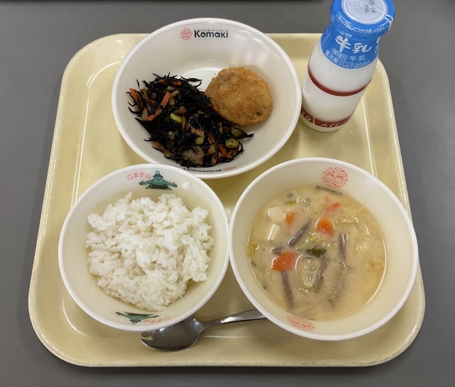 ごはん 牛乳 豆乳入りみそ汁 かつおフライ ひじきのいため煮