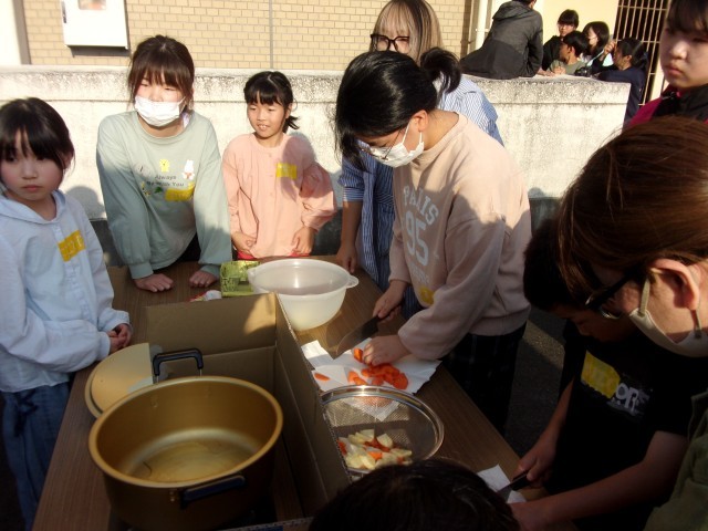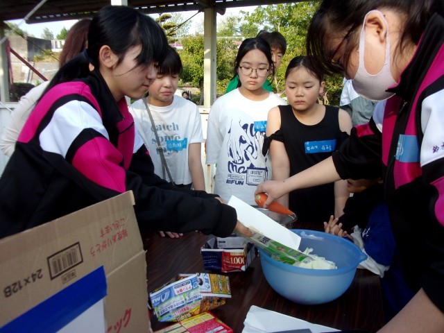 保護者や中学生ボランティアのみなさんに手伝ってもらいながら、力を合わせてカレーを作りました。