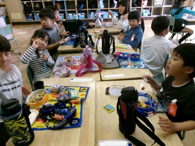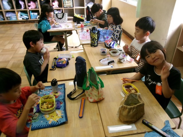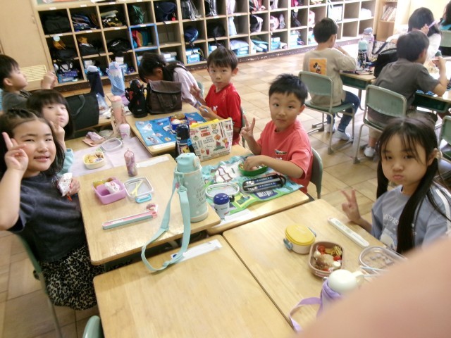 校外学習が雨天で翌日に延期されたため、1&2年生の昼食はお弁当になりました。