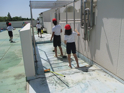デッキブラシやたわし、バケツ、チリトリなどを持って、担当場所で熱心に頑張る子どもたち。中には、全身びしょぬれになった子もいました。日差しはとても強かったのですが、弱音一つ言わず働いていました。