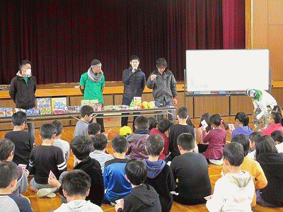 全員参加のビンゴ大会。目の前にずらっと並べられた色とりどりの賞品に、張り切る子どもたちです。数字が読み上げられるたびに、一喜一憂。歓喜と落胆の声が同時に上がります。見事ビンゴになってゲームを手に入れた子どもたちは、さっそく友達と遊んでいました。
