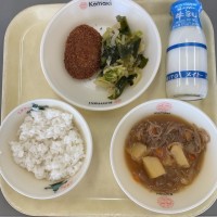 みんな大好きなカレーライス。食べ終わるのもとても早く、「もっと食べたい」という子もいました。ほうれんそうのサラダは、ひじきとコーン、ほうれんそうをしょうゆと砂糖で和えたサラダで、教室でマヨネーズをかけて食べました。ひじきが苦手な子も、美味しく食べられました。