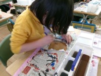 (2) 入れた 土の まんなかに なえを やさしく おきます。(手ぶれ ごめんなさい。)