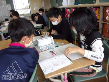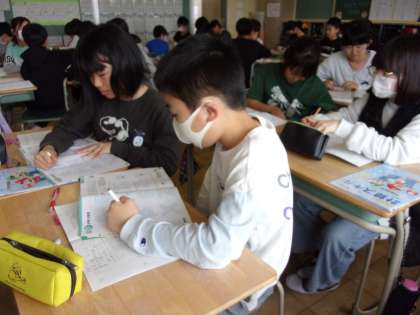 線対称な図形の性質を調べました。ペアの子に相談しながら、自分の考えをはっきりとさせていきました。