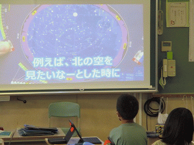 4年生が「星座板」の使い方を習っています。日付けや時刻の合わせ方、方角ごとの持...