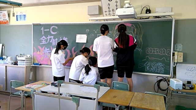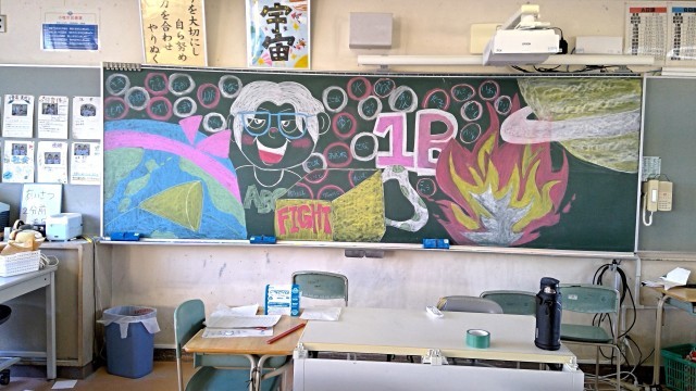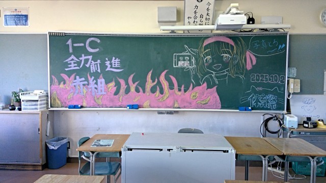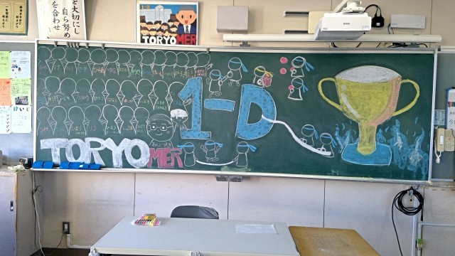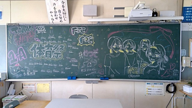 当日の各競技の生徒の活躍、応援はもちろんですが、実は、前日から黒板アートの制作が始まり、すでに各クラス応援合戦が繰り広げられていました。