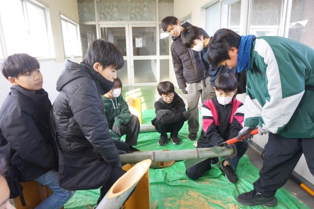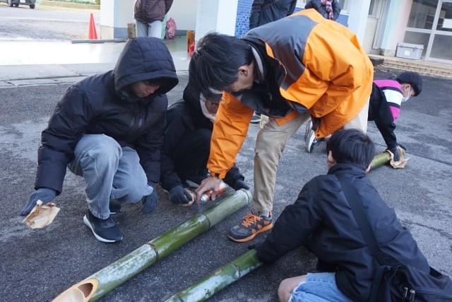 14日(日)、今年も地域の方々と一緒に門松づくりをしました。準備していただいた竹を切るところからスタート。